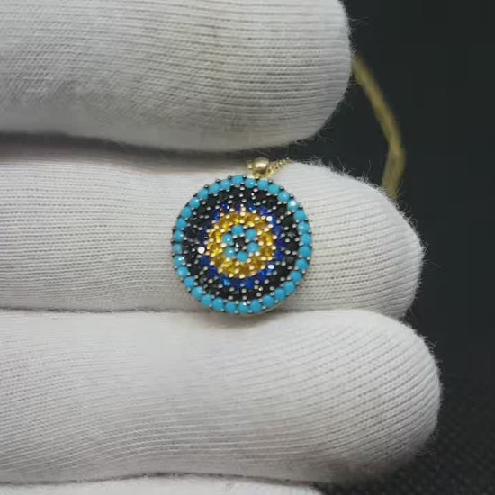 - Round Evil eye pendant necklace is made with high-quality 14K real solid gold. Its diameter is 0.59 inch (15 mm).