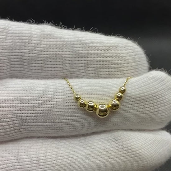 - Beaded ball necklace is made with high quality 14K real solid gold, including its cable chain. There are seven balls, and the ball's sizes are between 2MM and 5MM.