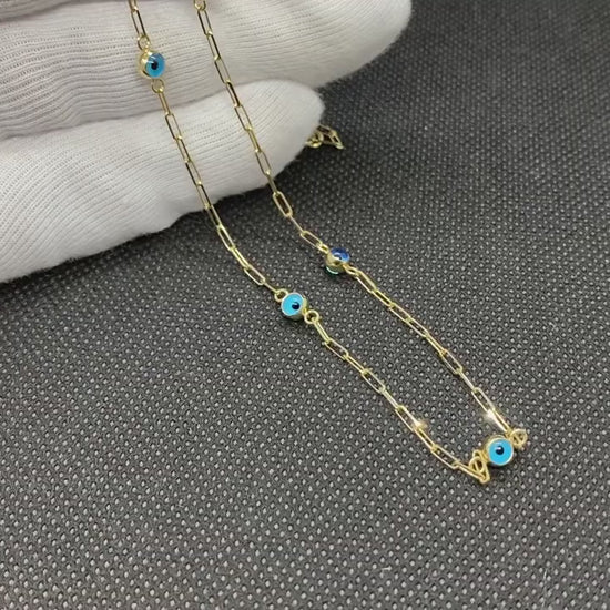 14K Real Solid Gold Beaded Evil Eye Necklace with Paperclip Chain