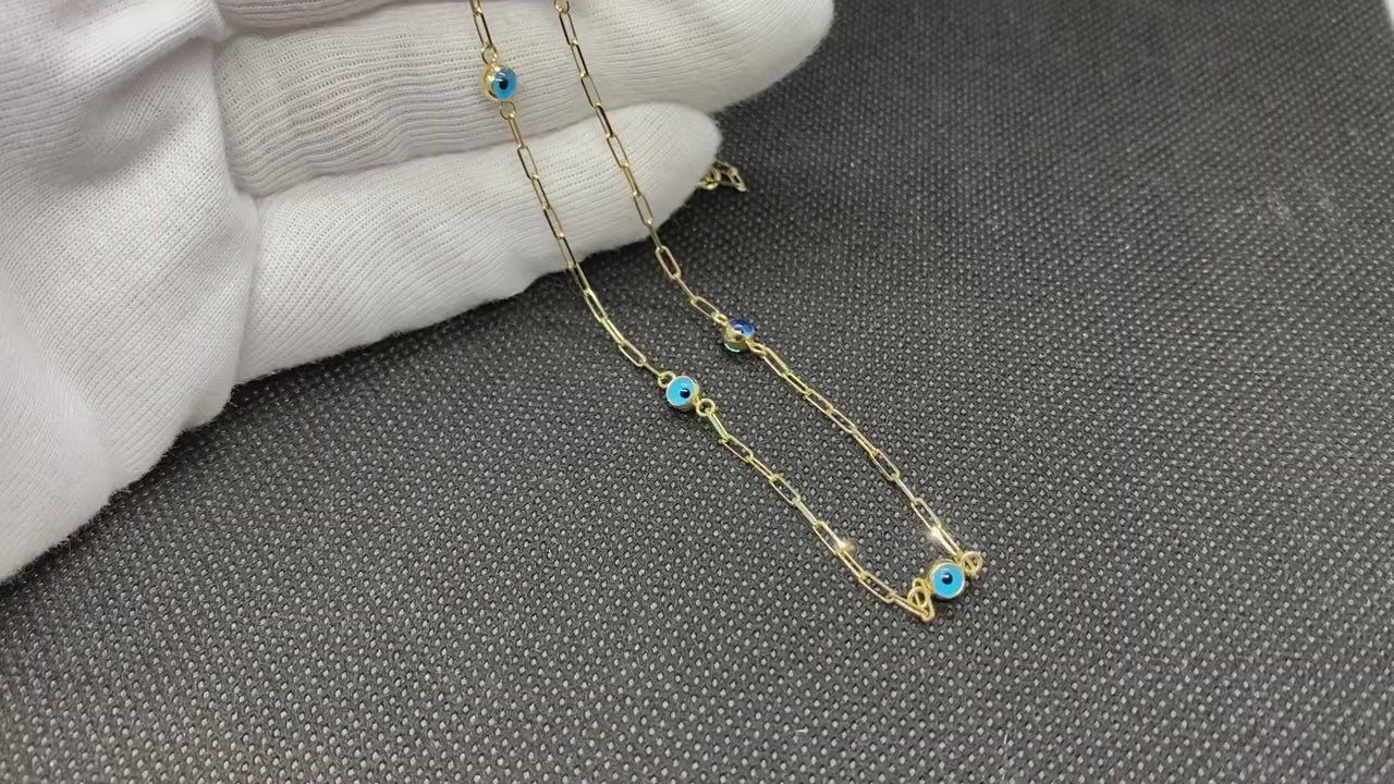 - Beaded evil eye necklace for women is made with high quality 14K solid gold paperclip chain.