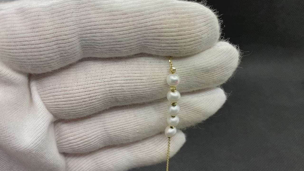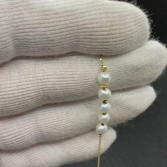 - Featuring a stunning beaded pearl bracelet in 14K solid gold, freshwater pearl jewelry is sure to catch the eye of anyone who sees it. Dainty gold bracelet adds a touch of elegance and femininity to the design, making it the perfect necklace for of all ages.