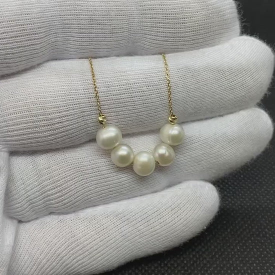 - Beaded pearl necklace is decorated with five Cultured Freshwater Pearls. Every pearl size is 6MM and their shape is oval.