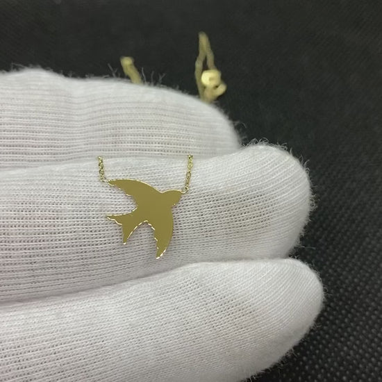 - Featuring a stunning Dainty Swallow Necklace in 14K solid gold, Bird necklace jewelry is sure to catch the eye of anyone who sees it. Dainty gold necklace adds a touch of elegance and femininity to the design, making it the perfect necklace for of all ages.