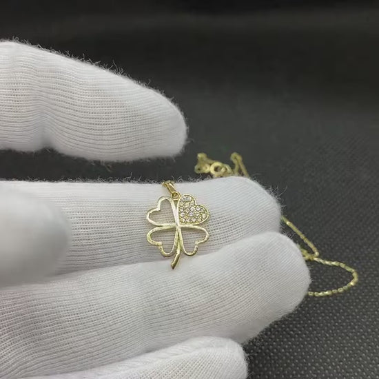 - Four leaf clover necklace is made with high-quality 14K solid gold. One of the clover is decorated with white cubic zirconia stones.