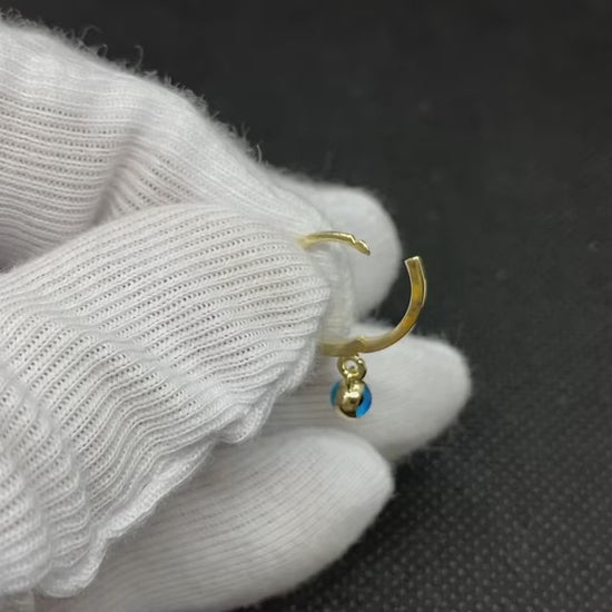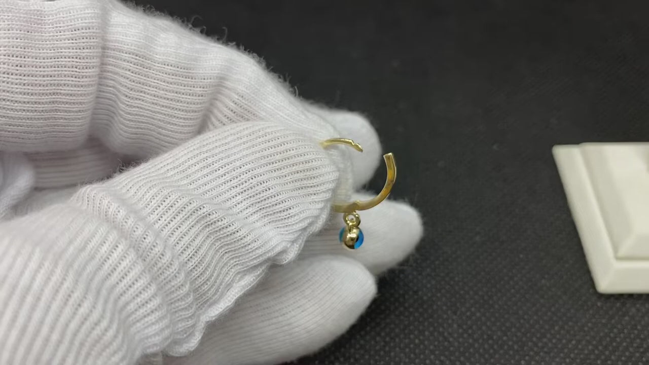 - 14K Real Solid Gold Dangle Drop Earrings is decorated with two sided evil eyes. (Internal diameter of the hoop is 9 MM, evil eye ball size is 4 MM. )