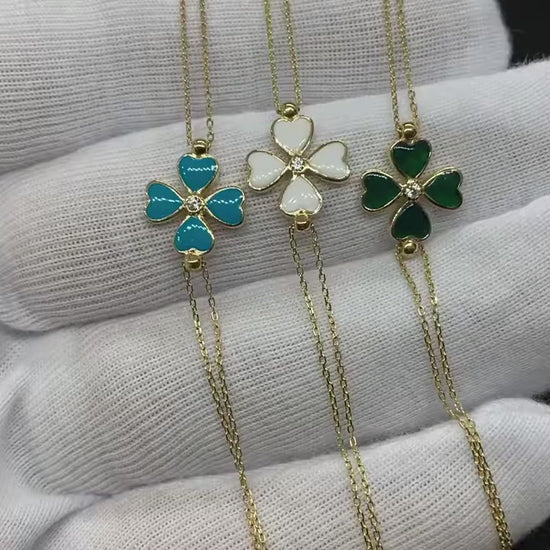 - Four Leaf Clover bracelet is made with high-quality 14K solid gold and decorated with a white cubic zirconia stone and green, white and turquoise enamel.