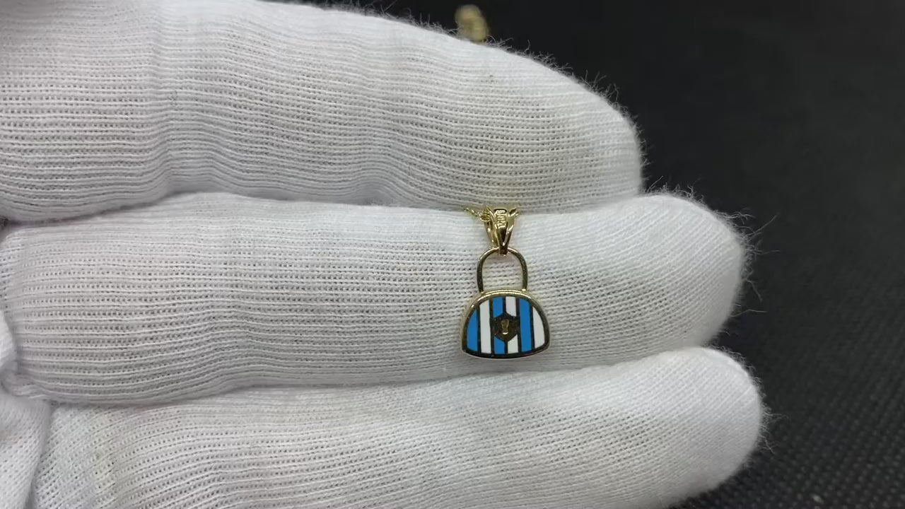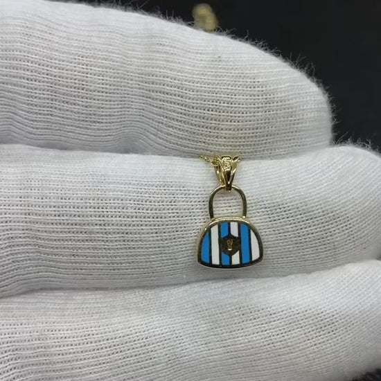 - Handbag pendant necklace is made with high-quality 14K solid gold decorated with white and turquoise enamel.