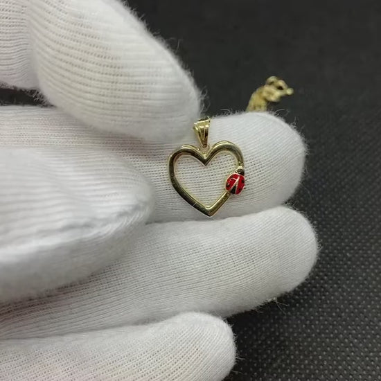 14K Real Solid Gold Heart Pendant Necklace with Ladybug