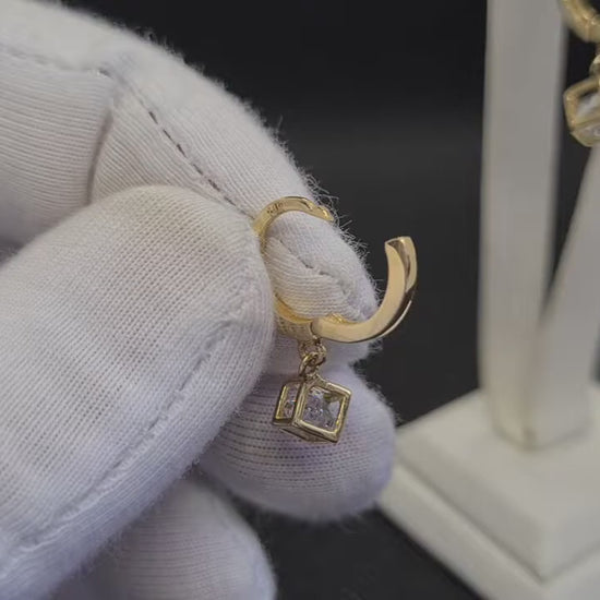 14K Real Solid Gold Dangle Drop Hoop Cube Earrings for Women