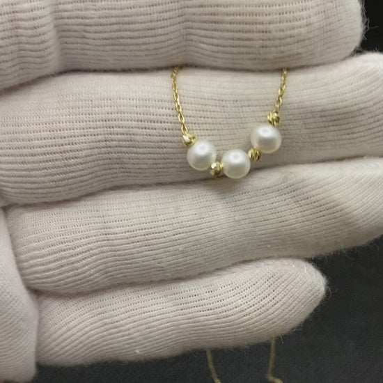 - Featuring a stunning trio pearl necklace in 14K solid gold, freshwater pearl jewelry is sure to catch the eye of anyone who sees it. Dainty gold necklace adds a touch of elegance and femininity to the design, making it the perfect necklace for of all ages.