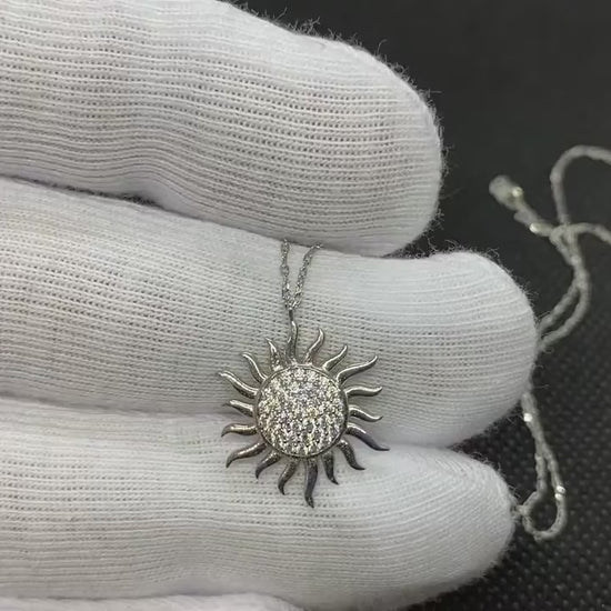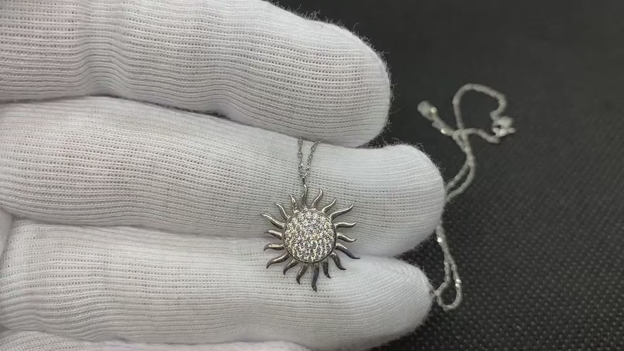 - 925K sterling silver sun pendant comes with a free 925K Sterling Silver chain and decorated with white cubic zirconia stones.